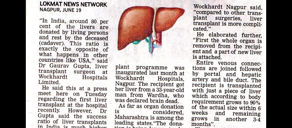 Successful Liver transplant surgery was performed on a 50 year old women from Mumbai. It is the 1st Liver Transplant Surgery at Wockhardt Superspeciality Hospital Nagpur. The liver transplant programme was inaugurated last month at Wockhardt Hopsitals, Nagpur.